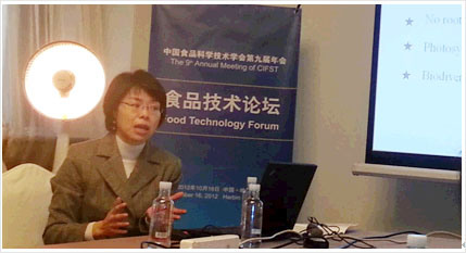 ??????? 我司研發(fā)總監(jiān)姜悅博士應(yīng)邀出席中國(guó)食品科學(xué)技術(shù)學(xué)會(huì)第九屆年會(huì),并與上海交通大學(xué)中美食品安全聯(lián)合研究中心主任史賢明教授共同主持食品技術(shù)論壇(英文)。會(huì)議期間,姜博士作了題為“微藻降膽固醇功效研究”的英文報(bào)告。報(bào)告中姜博士提出,根據(jù)動(dòng)物實(shí)驗(yàn)結(jié)果表明: 潤(rùn)科生物培養(yǎng)的微藻產(chǎn)品是一種可以從根本上促進(jìn)膽固醇排泄的物質(zhì),有很廣的應(yīng)用前景。報(bào)告受到國(guó)內(nèi)外與會(huì)專(zhuān)家學(xué)者的高度關(guān)注和熱烈的討論, 得到與會(huì)者的一致好評(píng)。
