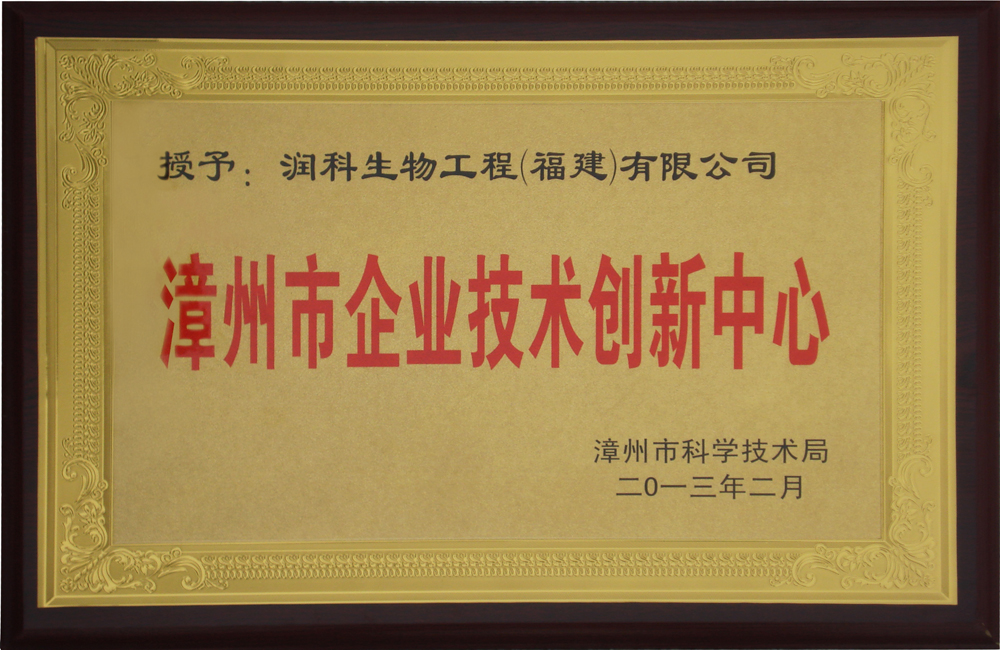 ????? 2013年2月,為進一步貫徹落實漳州市十五屆人大二次會議和政協(xié)第十二屆漳州市委第二次會議的會議精神,促進科技型企業(yè)成為技術(shù)創(chuàng)新主體,提高其自主創(chuàng)新能力和競爭力。經(jīng)漳州市科學技術(shù)局研究,決定認定潤科生物工程(福建)有限公司為2012年度漳州市企業(yè)技術(shù)創(chuàng)新中心之一,并授予銅匾。
