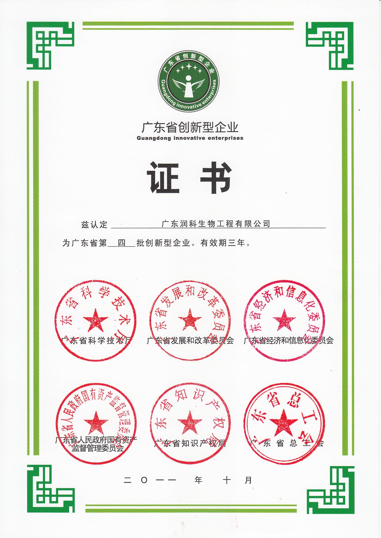 ?????? 2011年10月,第四批廣東省創(chuàng)新型企業(yè)名單出爐,廣東潤科生物工程有限公司榜中有名,順利通過廣東省科技廳、省發(fā)改委、省經(jīng)信委、省國資委、省知識產(chǎn)權(quán)局和省總工會六部門考核,躋身廣東省創(chuàng)新型企業(yè)的行列。
