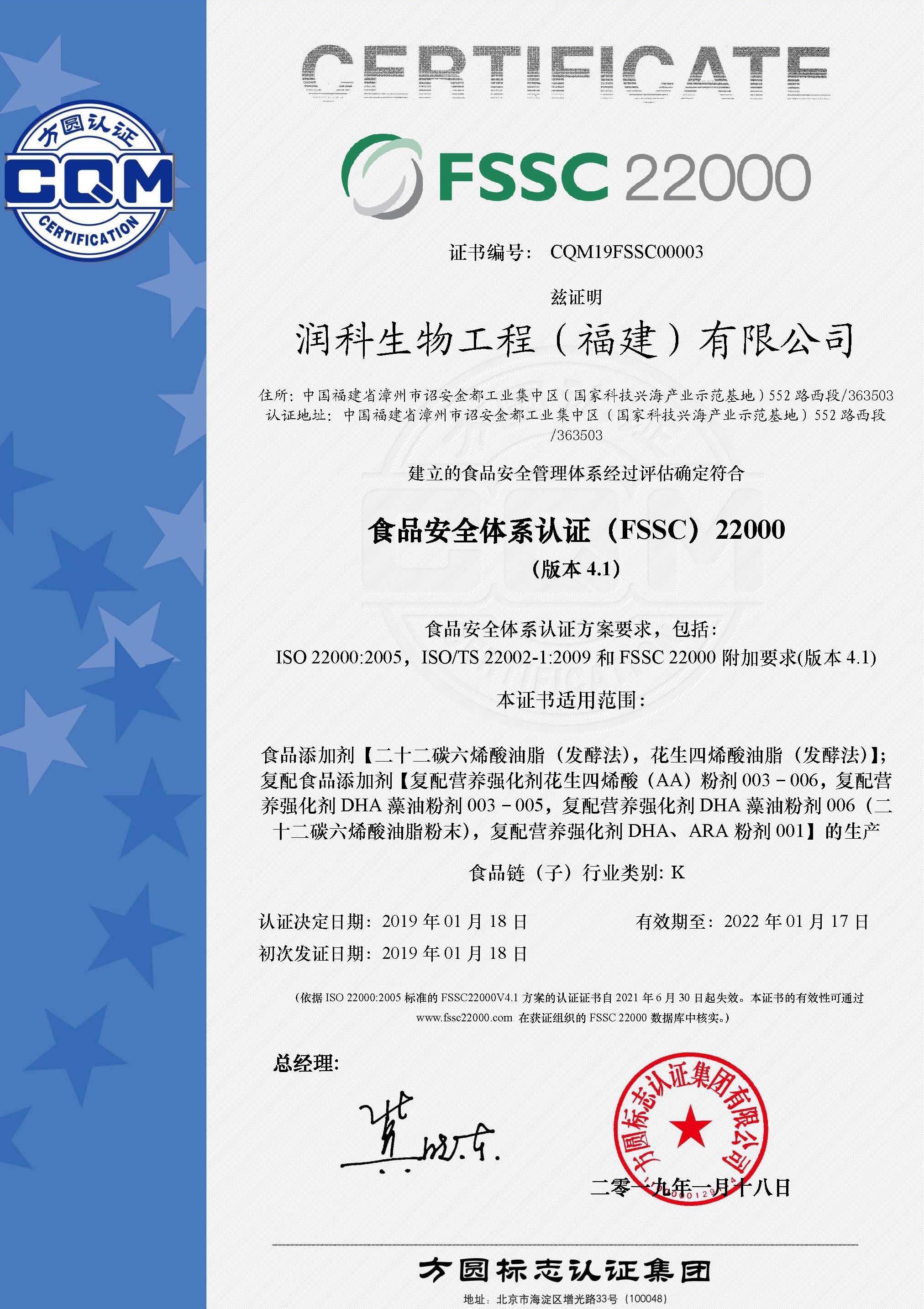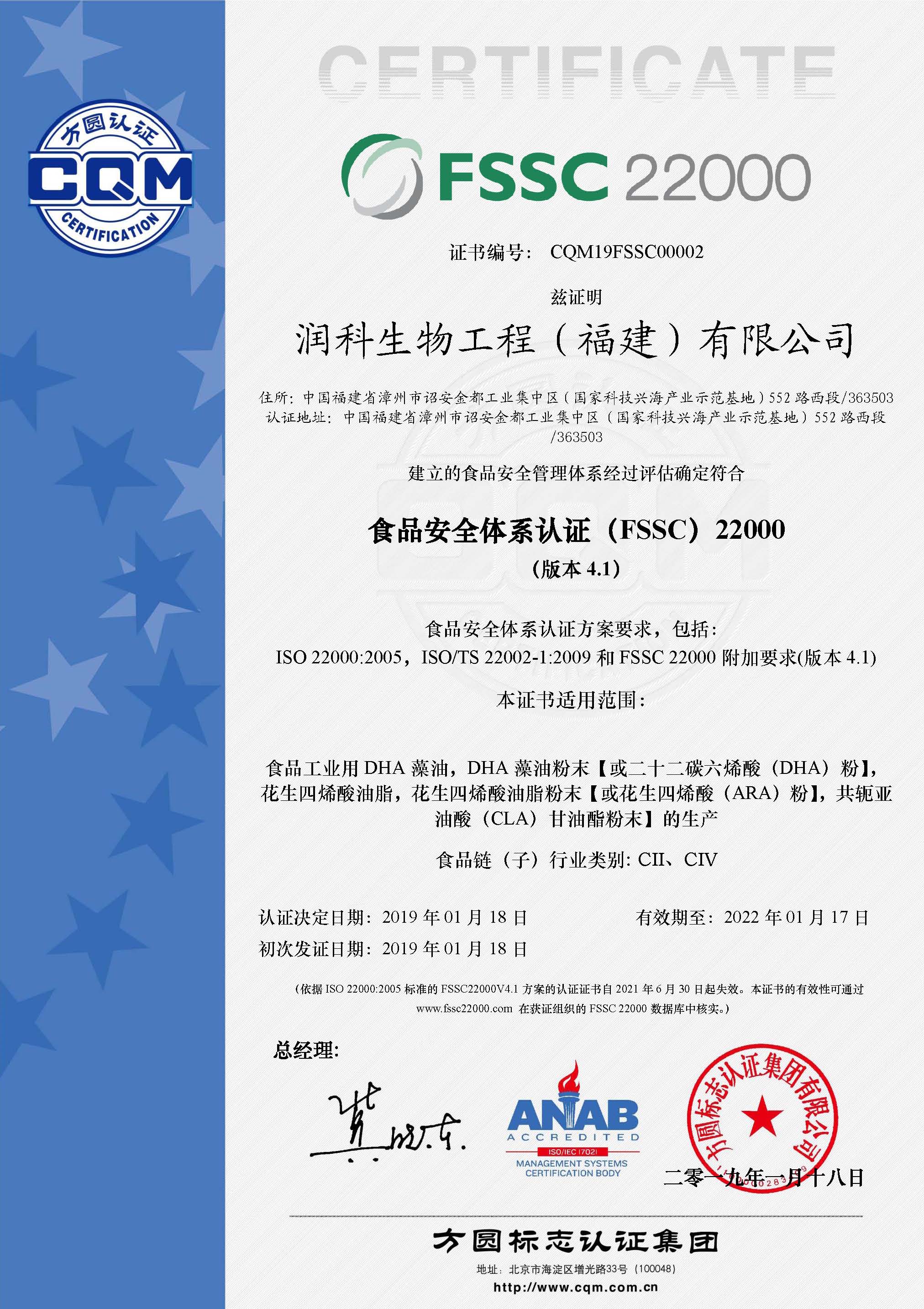 ?????? 2018年12月,經(jīng)過方圓標志認證集團(CQM)專業(yè)審核小組為期四天、嚴格細致的現(xiàn)場評審后,潤科生物工程(福建)有限公司順利通過了食品安全體系(FSSC)22000(版本4.1)的認證審核,并于2019年1月18日正式喜獲證書。