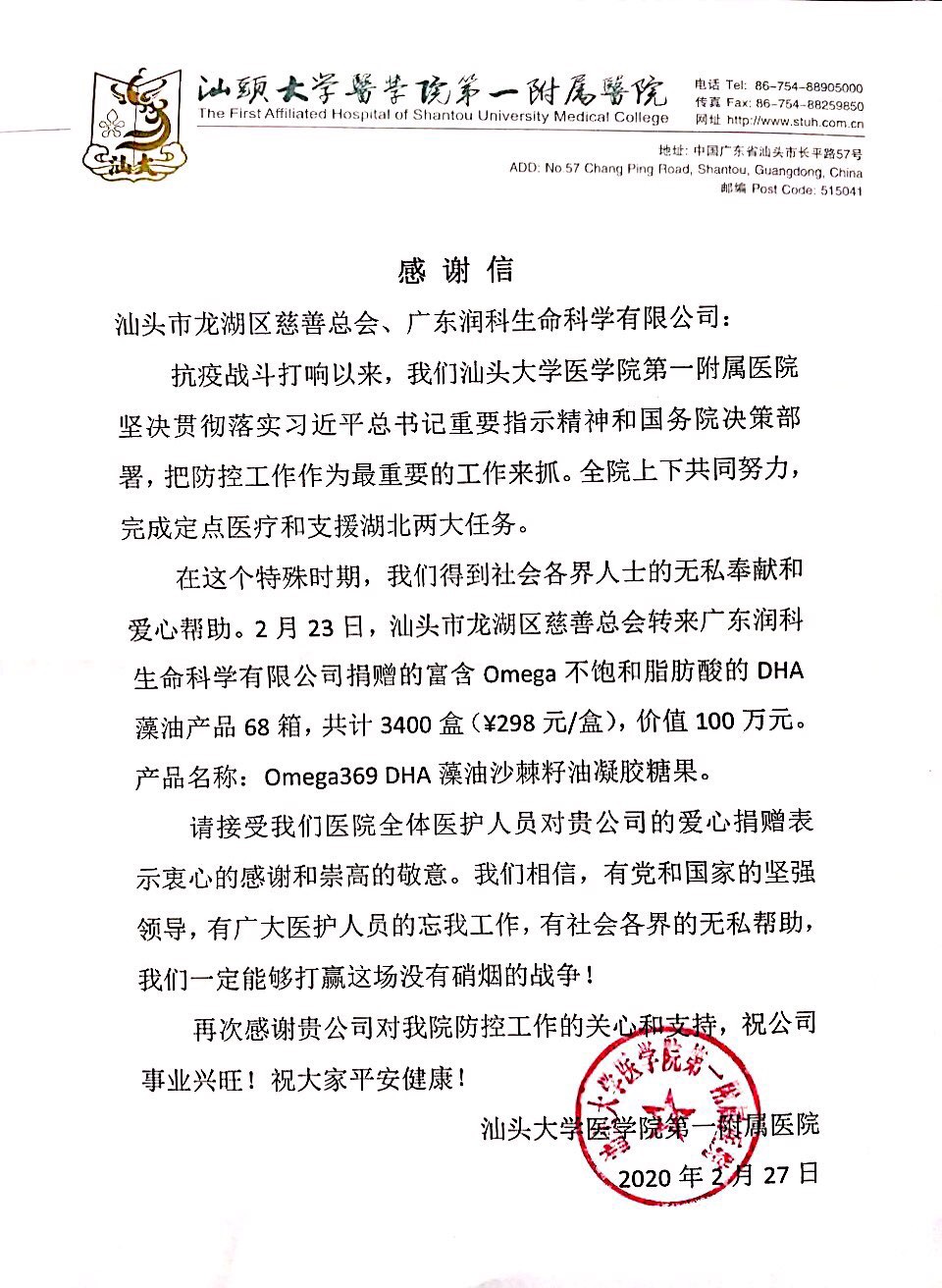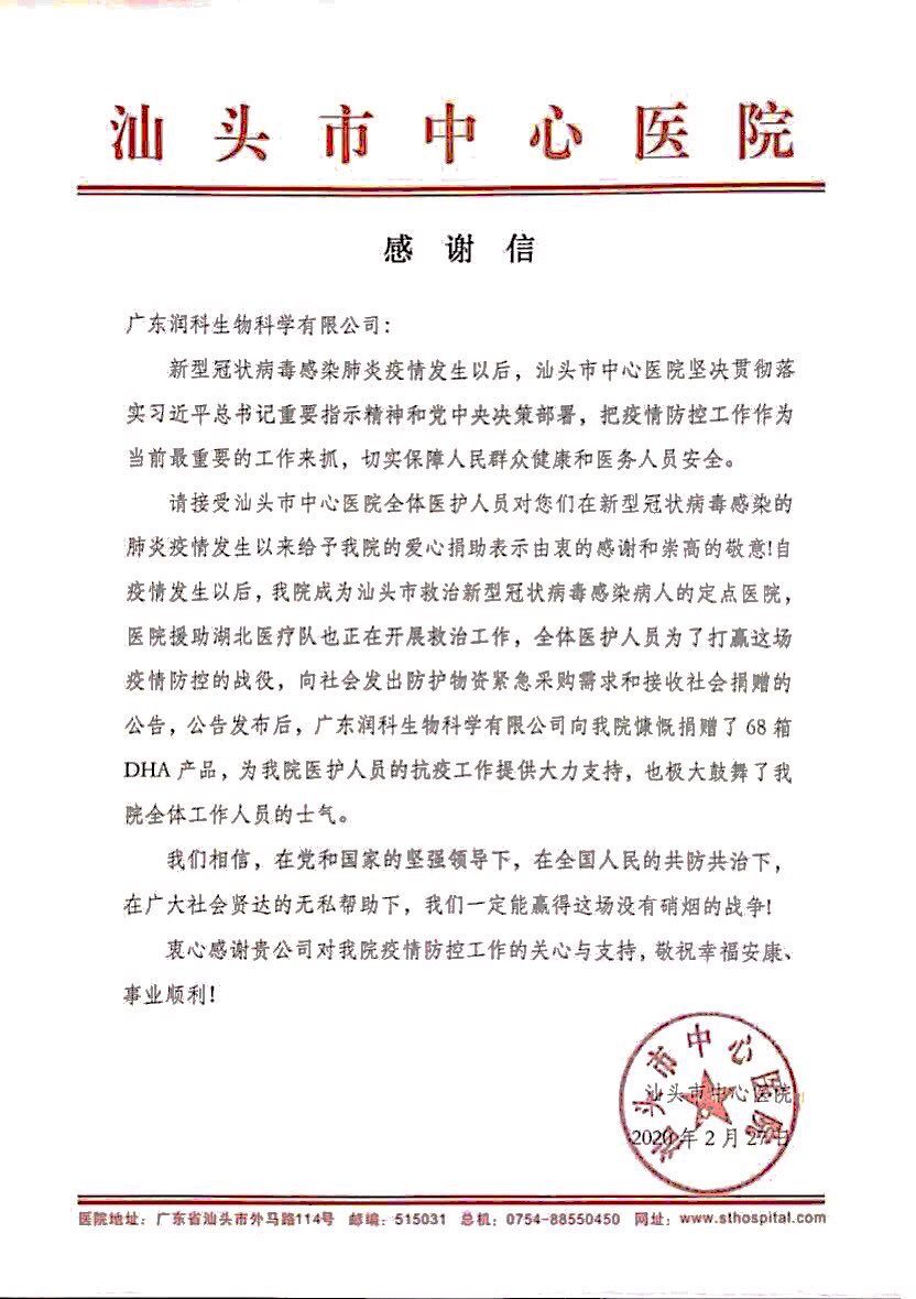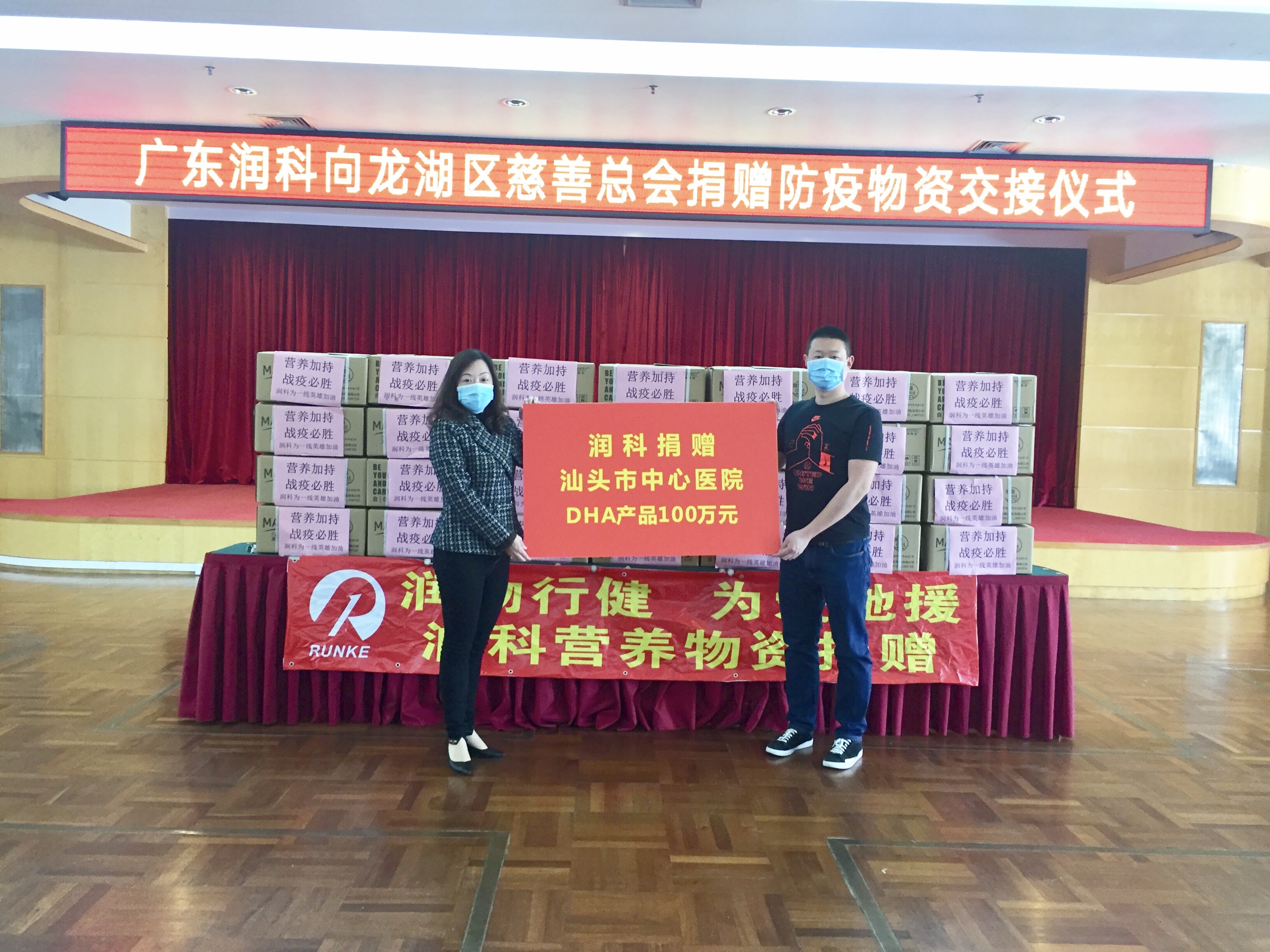 ?????? 2020年2月23日,潤科通過汕頭市龍湖區(qū)慈善總會,向汕頭市最先收治新冠肺炎患者的兩家醫(yī)療機構——汕頭市中心醫(yī)院和汕頭大學醫(yī)學院第一附屬醫(yī)院,捐贈了價值共200萬元的DHA營養(yǎng)產(chǎn)品,為抗擊疫情的醫(yī)護人員們提供營養(yǎng)支持。