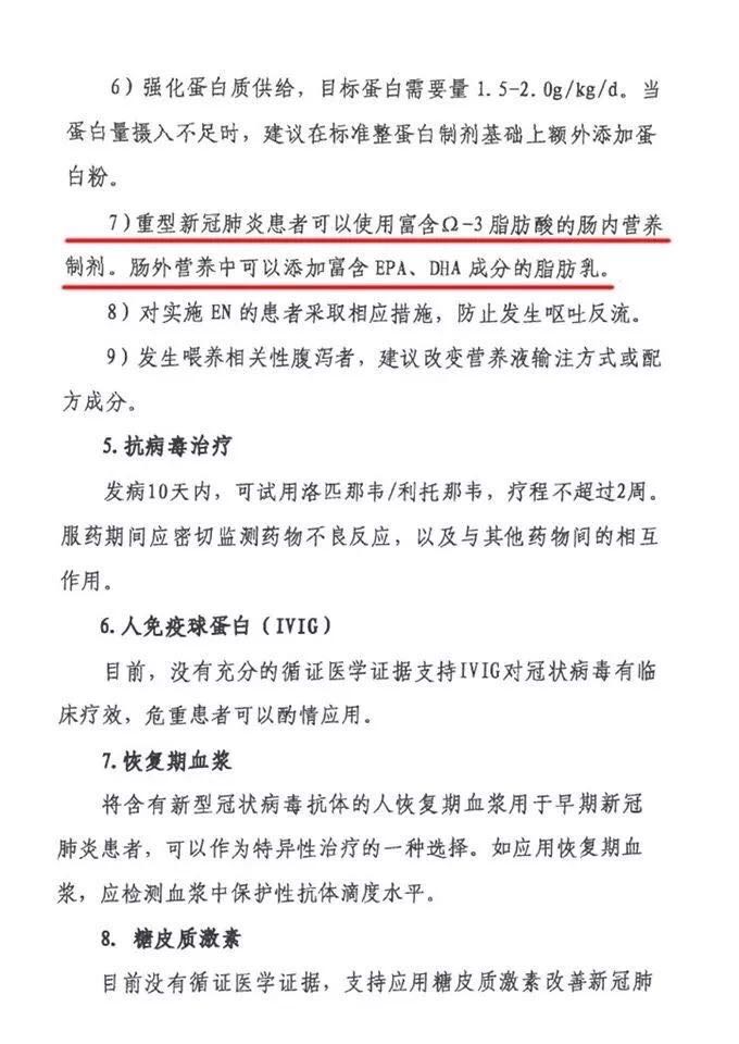 ?????? 2月14日,國家衛(wèi)健委發(fā)布了新型冠狀病毒肺炎重型、危重型病例診療方案(試行 第二版),將Omega-3脂肪酸的腸內(nèi)營養(yǎng)制劑納入重型新冠肺炎患者的治療措施之一,建議將DHA和EPA作為腸外營養(yǎng)補充,助力免疫系統(tǒng)正常運行。
