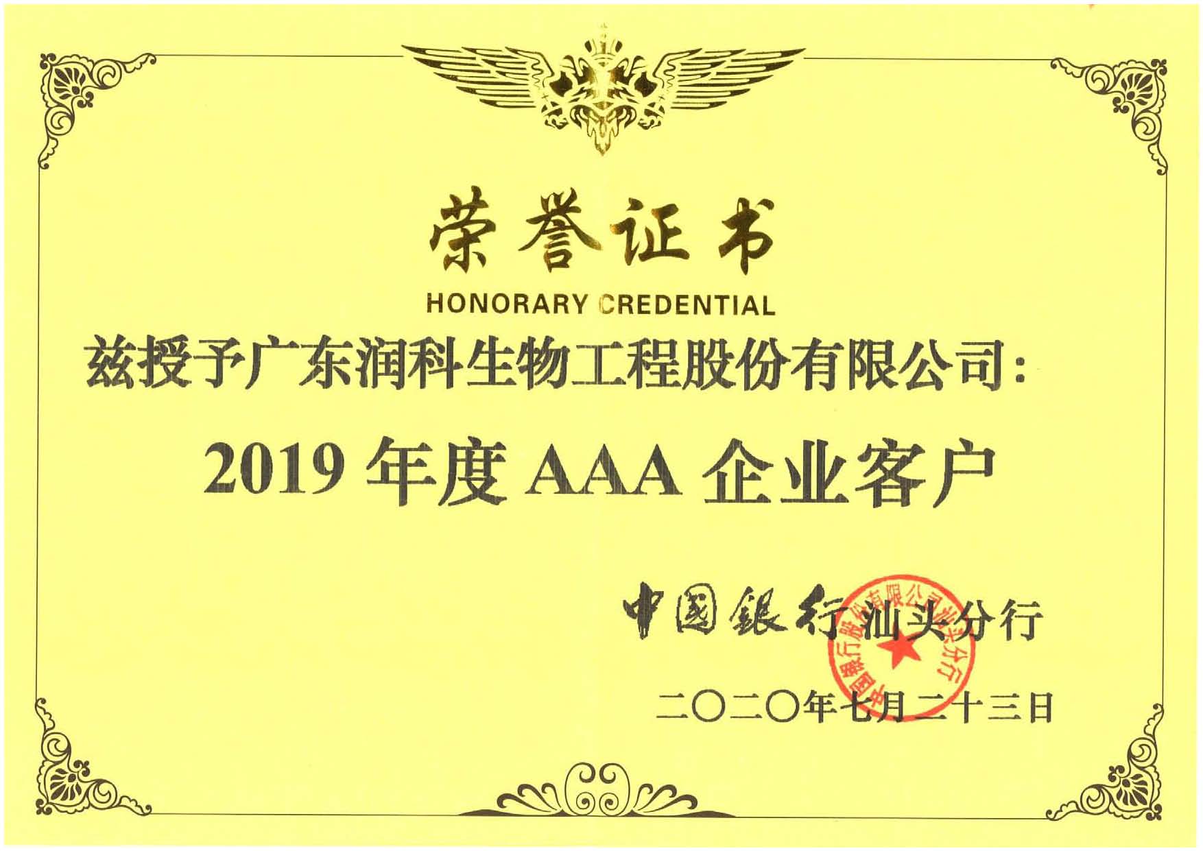 公司榮獲中國銀行授予2019年度AAA企業(yè)客戶證書