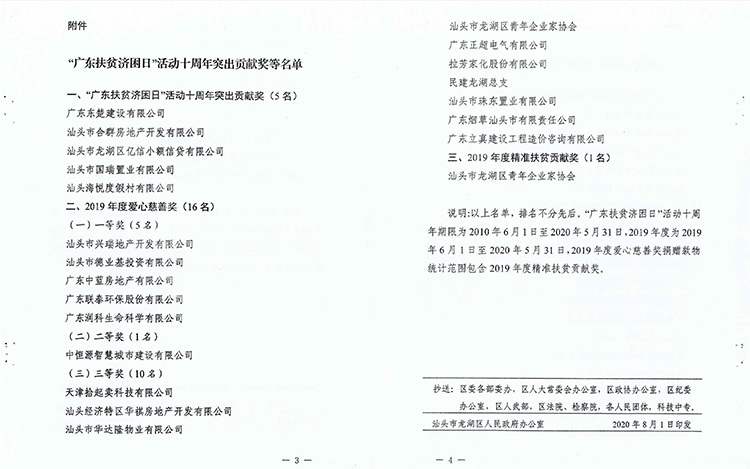 ????? 2020年6月獲得汕頭市龍湖區(qū)慈善總會(huì)頒發(fā)的“熱心公益 樂(lè)善好施”榮譽(yù)證書(shū),2020年8月獲得汕頭市龍湖區(qū)人民政府授予的“2019年度愛(ài)心慈善獎(jiǎng)”。