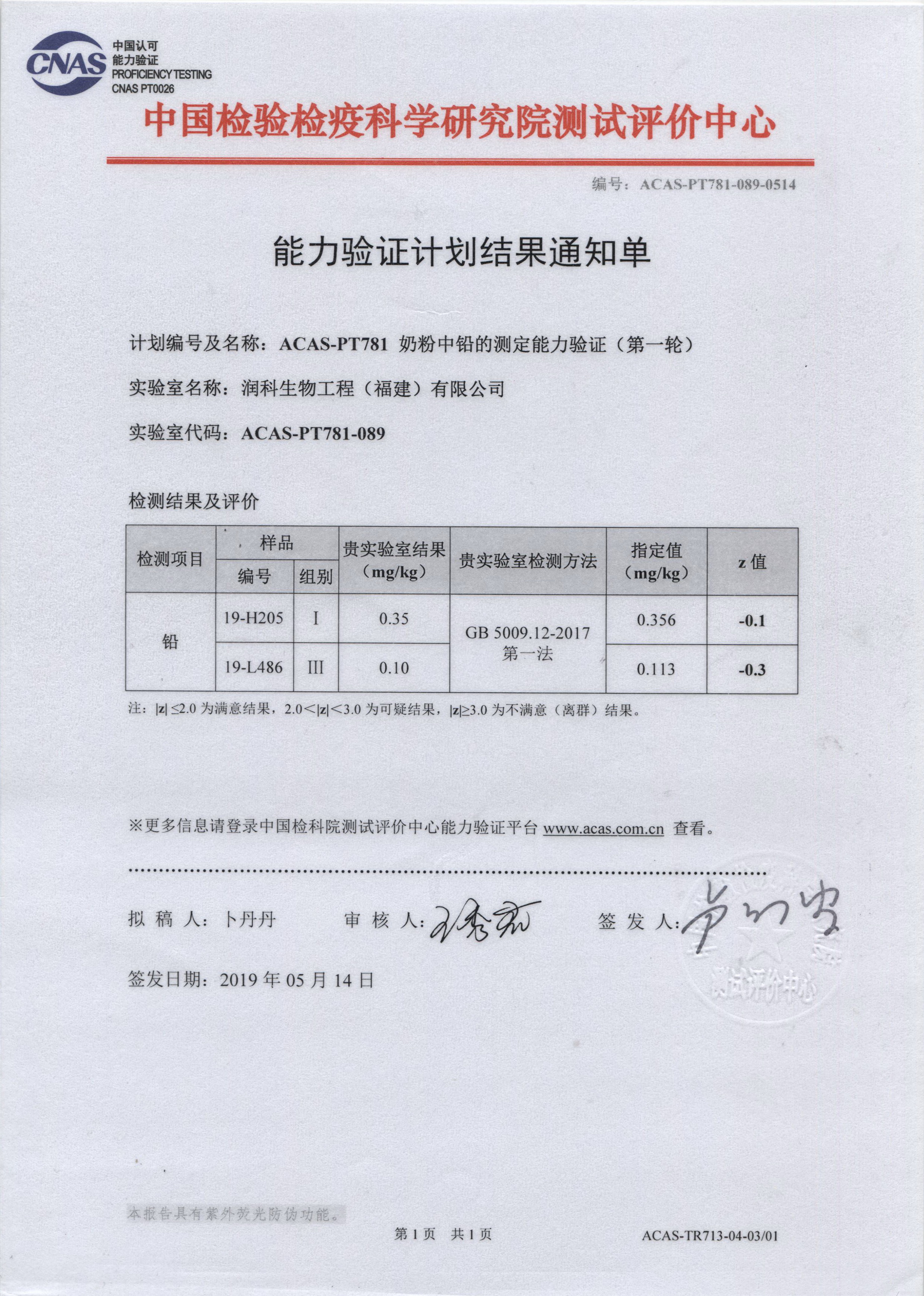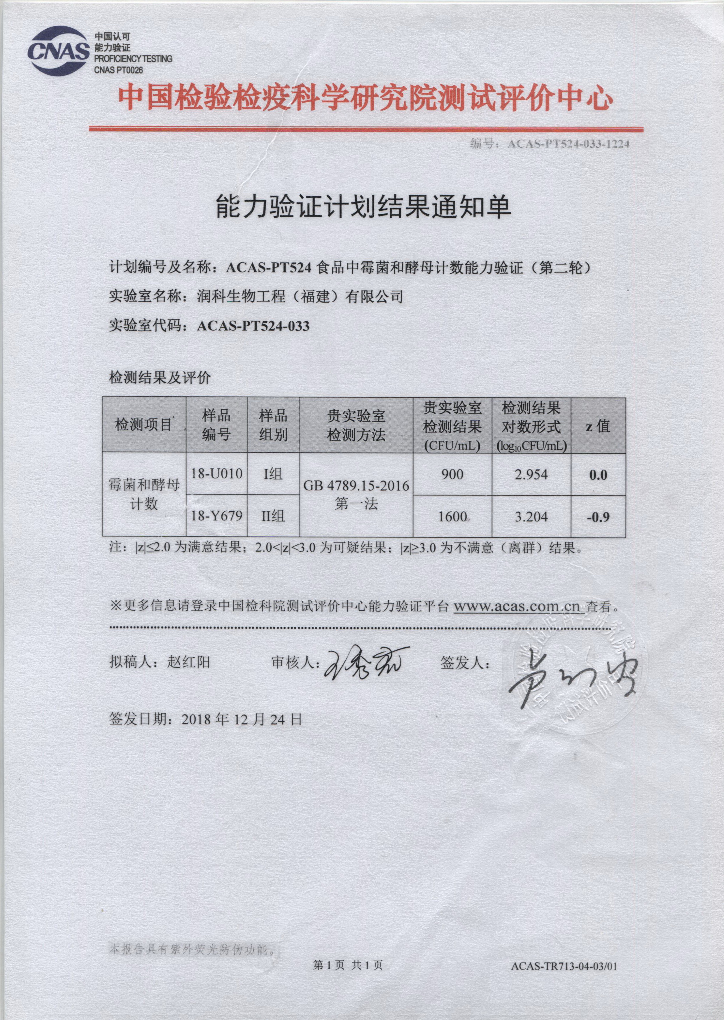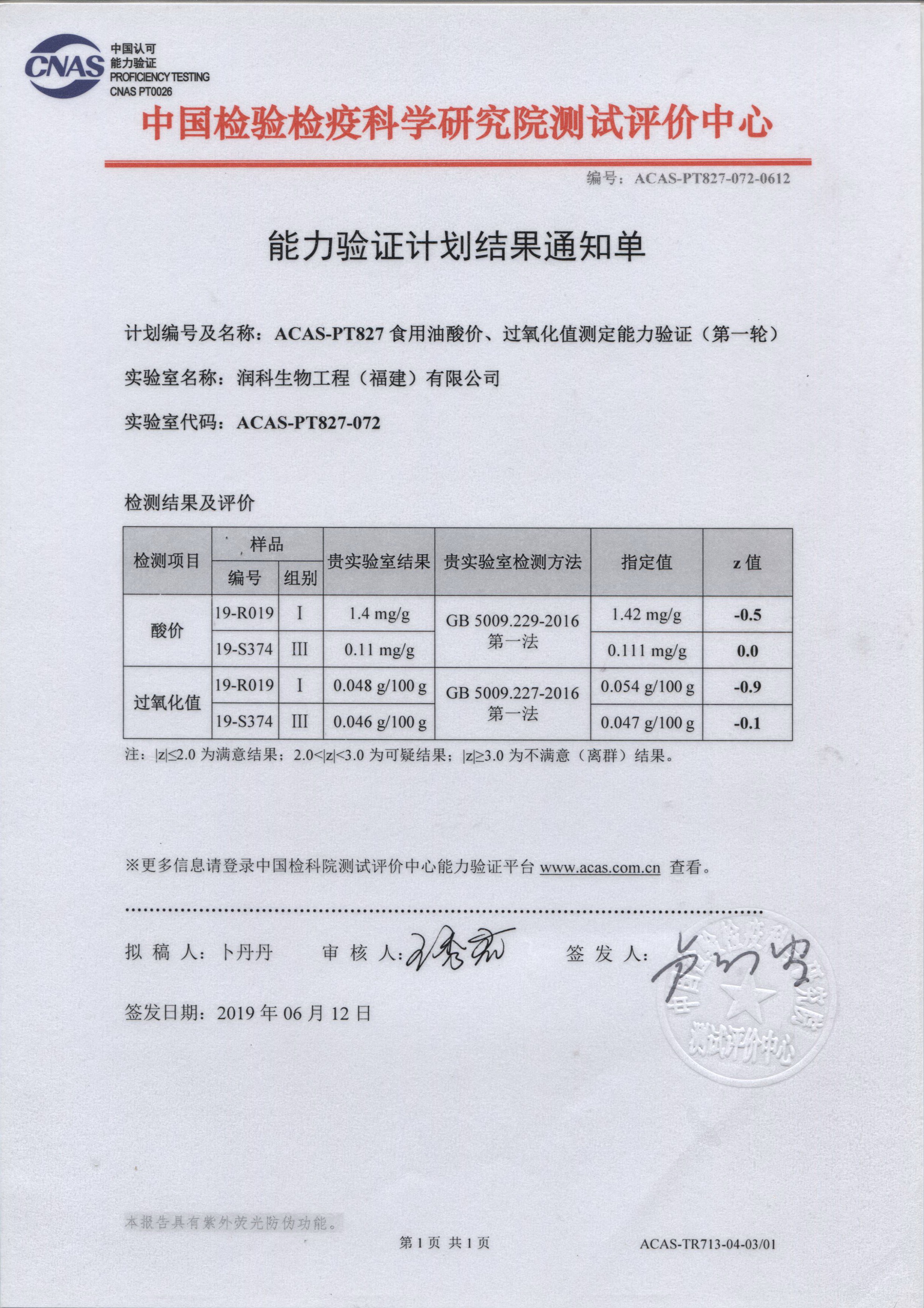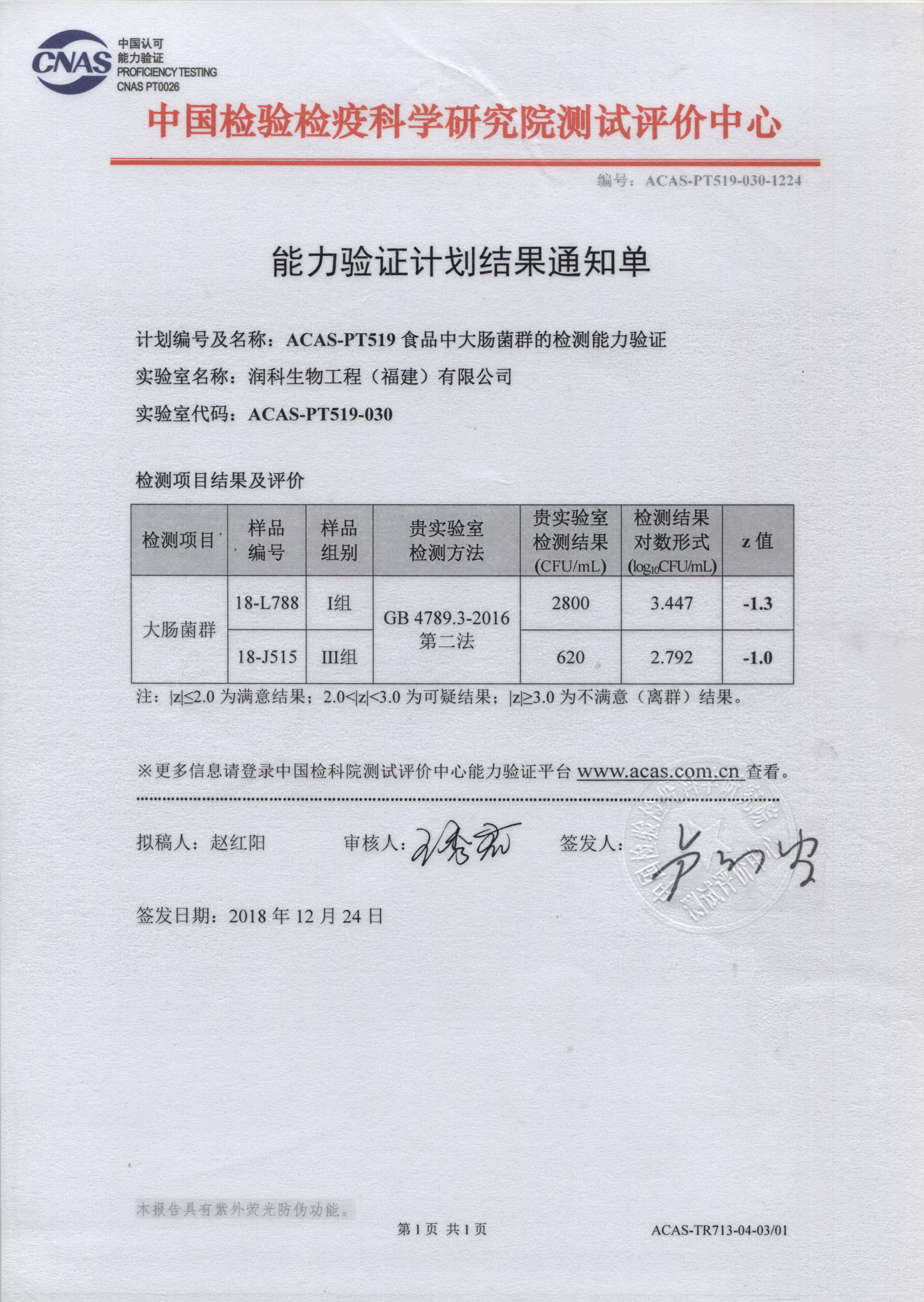 ?????? 潤科生物中心實(shí)驗(yàn)室積極參加中國檢驗(yàn)檢疫科學(xué)研究院測試評價(jià)中心開展的能力驗(yàn)證計(jì)劃,累計(jì)已參與了鄰苯二甲酸二丁酯、硝酸鹽、菌落總數(shù)、大腸菌群、阪崎腸桿菌、霉菌和酵母計(jì)數(shù)、鉛、酸價(jià)、過氧化值等15項(xiàng)指標(biāo)檢測能力驗(yàn)證,驗(yàn)證評價(jià)結(jié)果均為滿意。